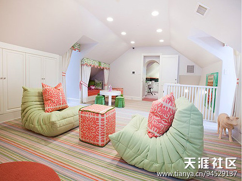 卧室的不规则却一点也没有影响到仆人的表情,巧妙的规划将卧室规划得体,白色的卧室设想展示出仆人文雅的一面,条纹的地毯与之搭配更是相得益彰,时髦的懒人椅以及桃红色抱枕,心爱中带有一丝调皮,也正契合女孩们的性格卧室设想效果图。