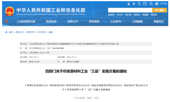 工业和信息化部9月14日发布,为贯彻落实《“十四五”原材料工业发展规划》,推动原材料工业增品种、提品质、创品牌,工业和信息化部、国务院国有资产监督管理委员会、国家市场监督管理总局、国家知识产权局联合制定了《原材料工业“三品”实施方案》并于近日印发。