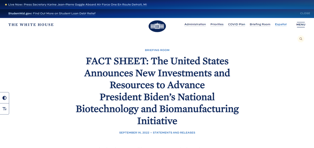 9月14日,白宫举办“国家生物技术和生物制造计划峰会”,宣布提供20多亿美元的资金,以推进拜登总统的行政命令。该行政令将加速生物技术创新,并在多个领域发展美国的生物经济,包括制药业、农业、塑料和能源等一系列行业。