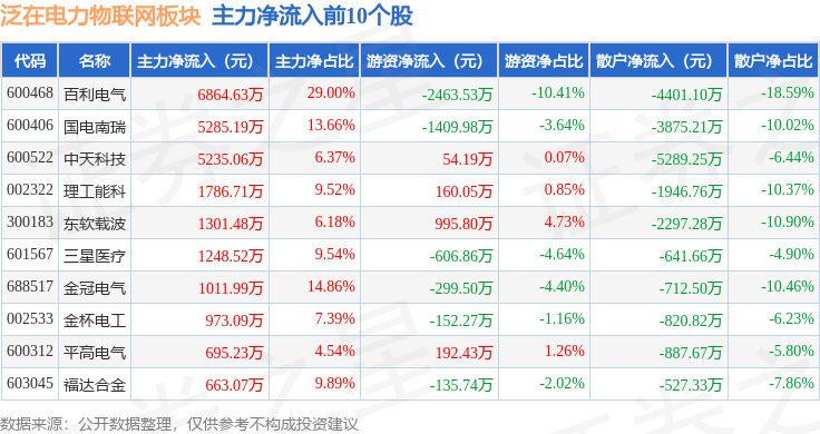 从资金流向上来看,当日泛在电力物联网板块主力资金净流出7.41亿元,游资资金净流出1904.04万元,散户资金净流入7.6亿元。泛在电力物联网板块个股资金流向见下表: