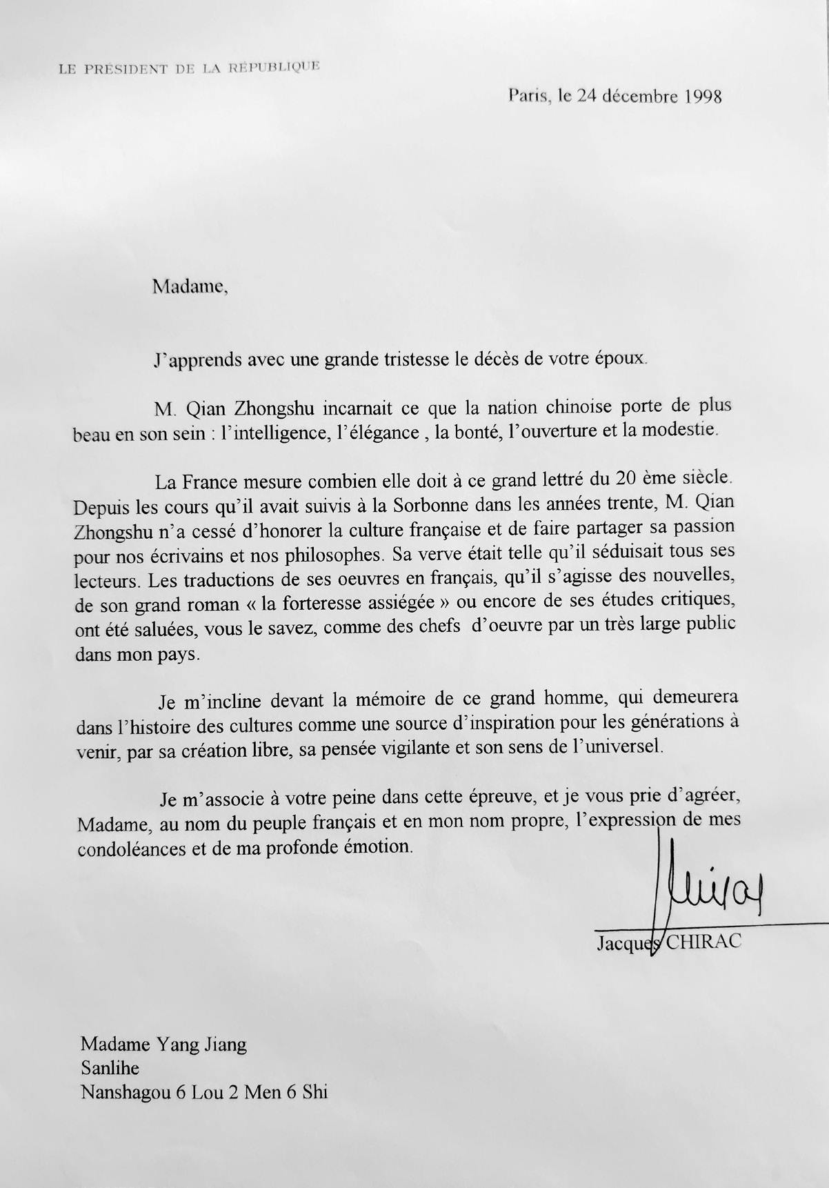 时任法兰西共和国总统雅克·希拉克在唁函中写道,“钱锺书先生身上体现了中华民族最美好的品质:智慧、优雅、善良、开放和谦逊……我向这位伟人鞠躬致意,他将以他的自由创作、审慎思想和全球意识,为文化历史所铭记,并成为未来世代的灵感源泉。”
