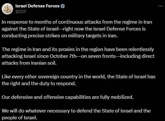 以色列国防军还警告称,其“防御和进攻能力已全面动员起来”。