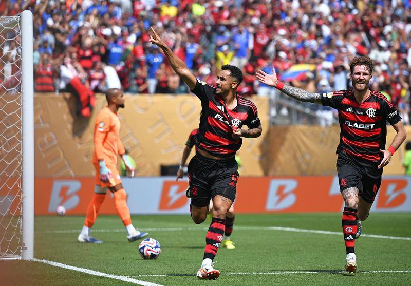6月20日,弗拉门戈队球员达尼洛(中)进球后庆祝。当日,在美国宾夕法尼亚州费城举行的2025年国际足联俱乐部世界杯(世俱