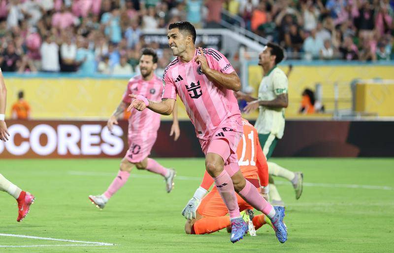 6月23日,迈阿密国际队球员苏亚雷斯(前)庆祝进球。当日,在美国迈阿密进行的2025年国际足联俱乐部世界杯(世俱杯)A组