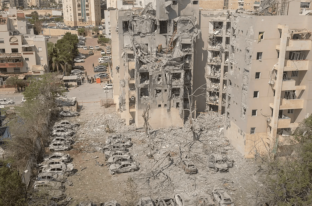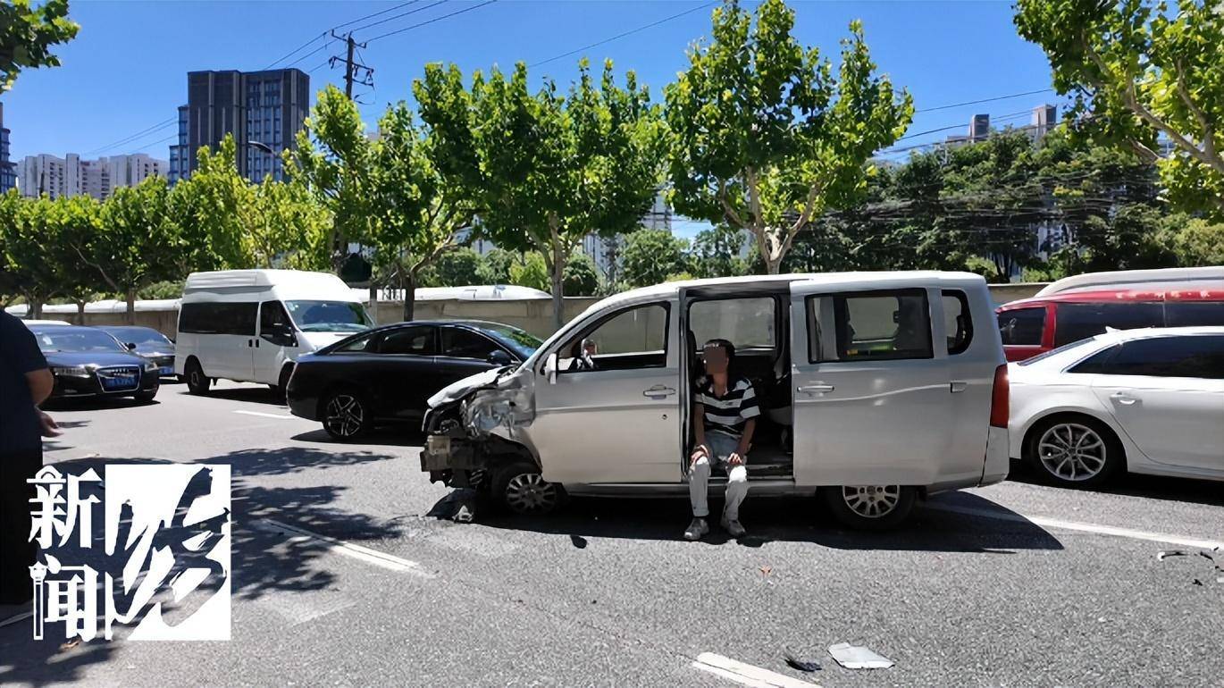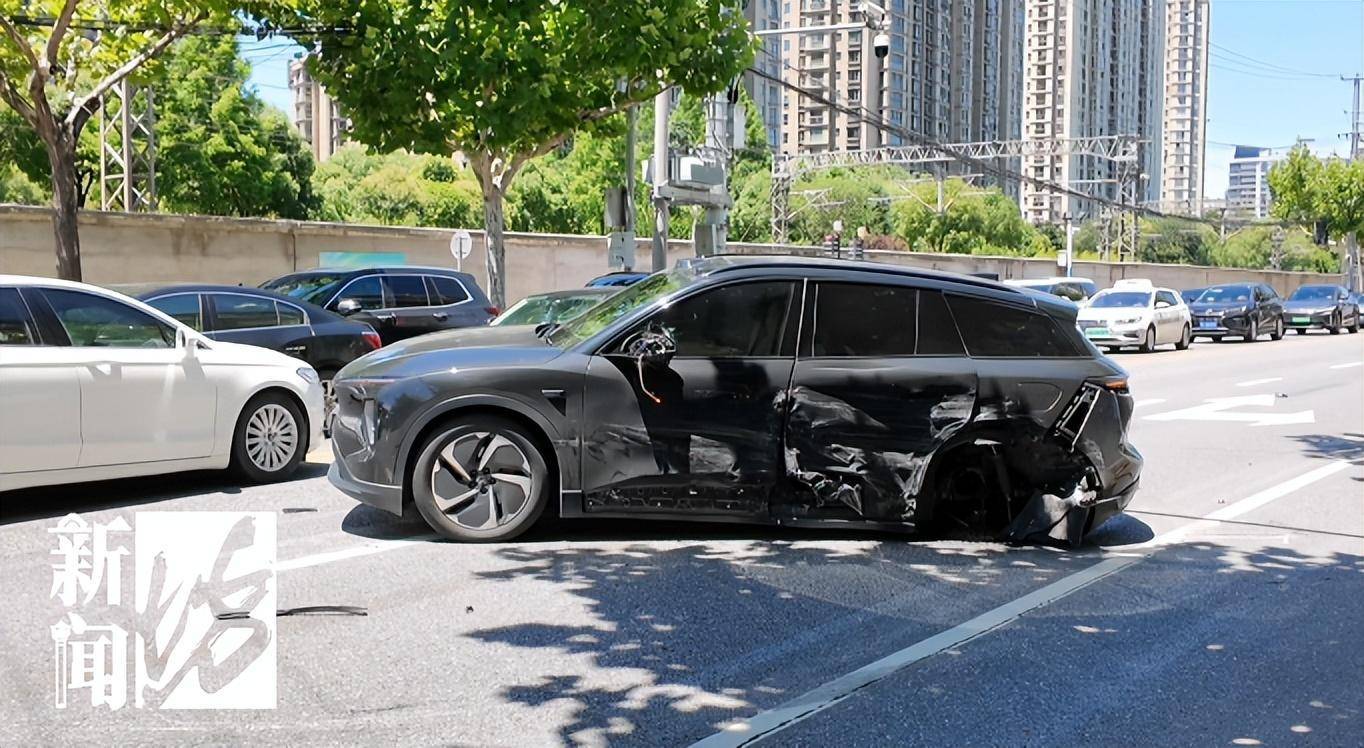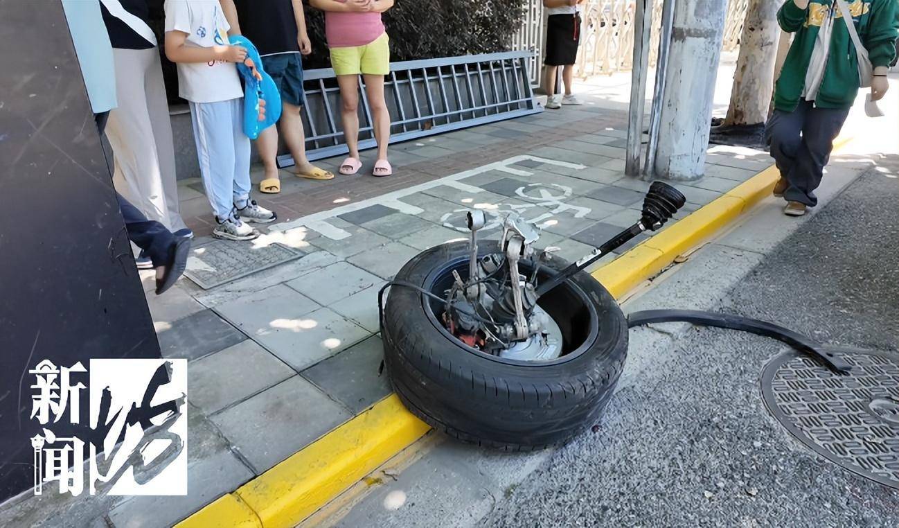 其中一辆车,整个轮胎被撞到上街沿边,马路上撒落着各类碎片。