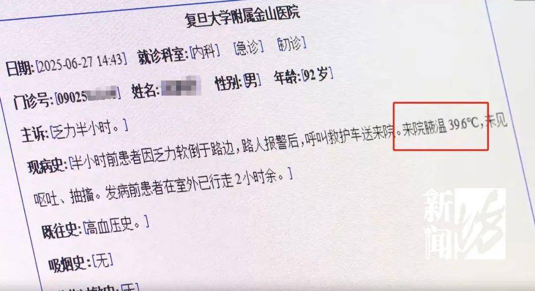 医生介绍,老人送医时,体温高达39.6度,氧饱和度降至92%,被诊断为中暑。