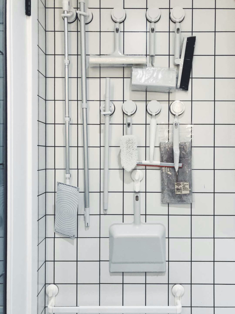 如今卫生间的好用清洁东西是越来越多了,可卫生间就那么大,收纳空间原来就不敷,所以像拖把、扫把、浴室刮水魔法扫把收纳就是一个问题。